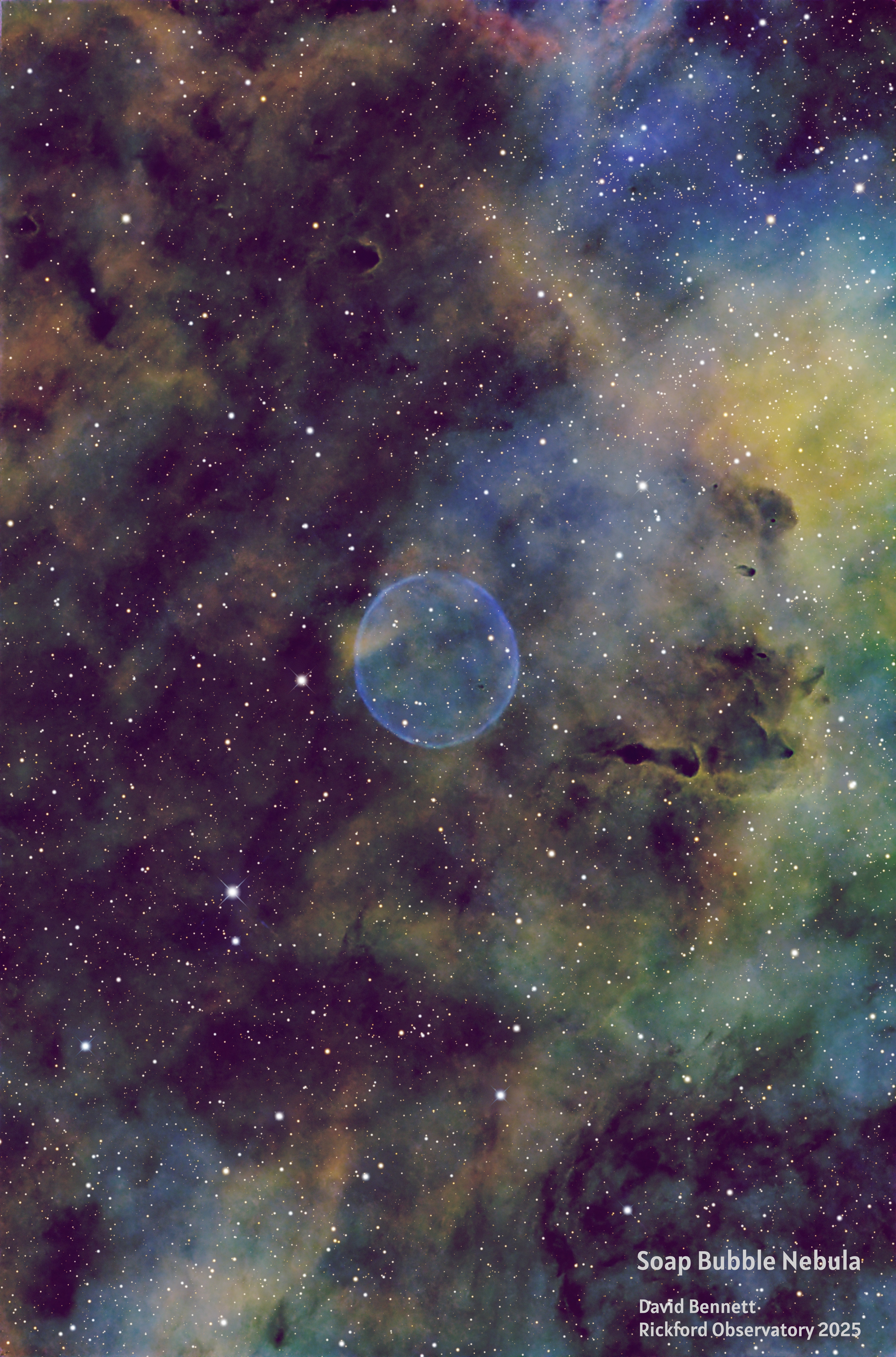 The soap Bubble Nebula discovered in 2007 by an amateur astronomer, Dave Jurasevich on Mount Wilson Observatory on a clear night when low cloud had rolled in obscuring the Los Angelos light pollution. This is a faint but lovely etheral subject so took on this 'interesting' challenge from my home town in wet and windy south-west England. A total of almost 700 5 min. frames ) taken in SHO (57 hours total integration time).