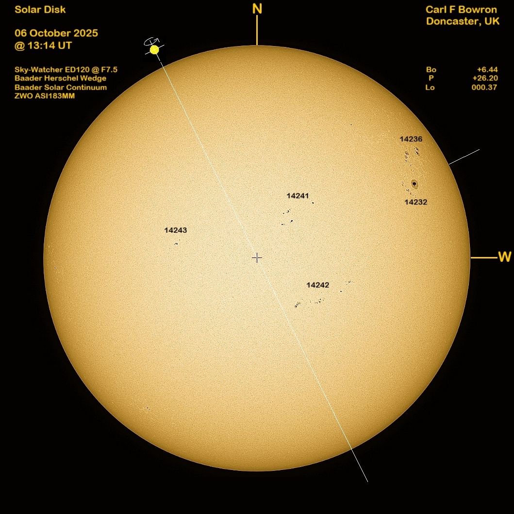 Observation by Carl Bowron: SUN 20251006 1314UT DISK WLIGHT CFB