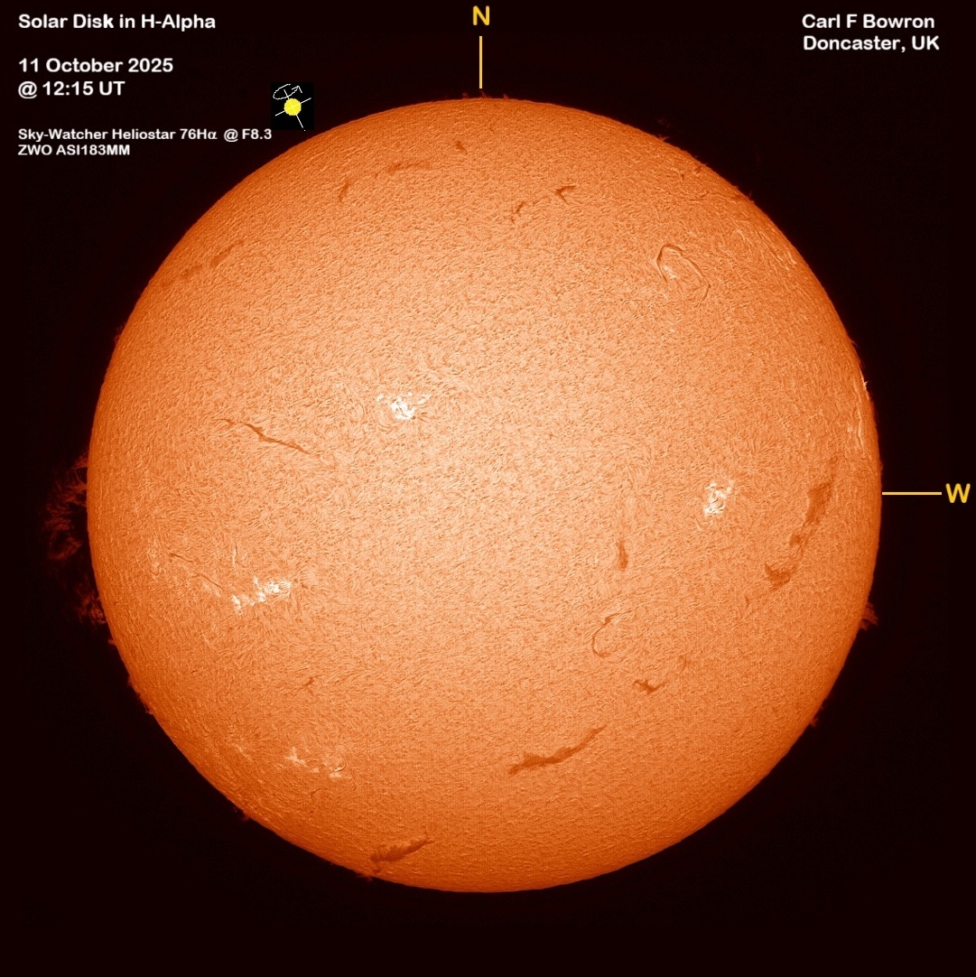 Observation by Carl Bowron: SUN 20251011 1215UT DISK HALPHA CFB