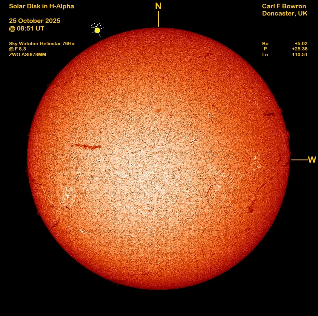 Observation by Carl Bowron: SUN 20251025 0851UT DISK HALPHA CFB