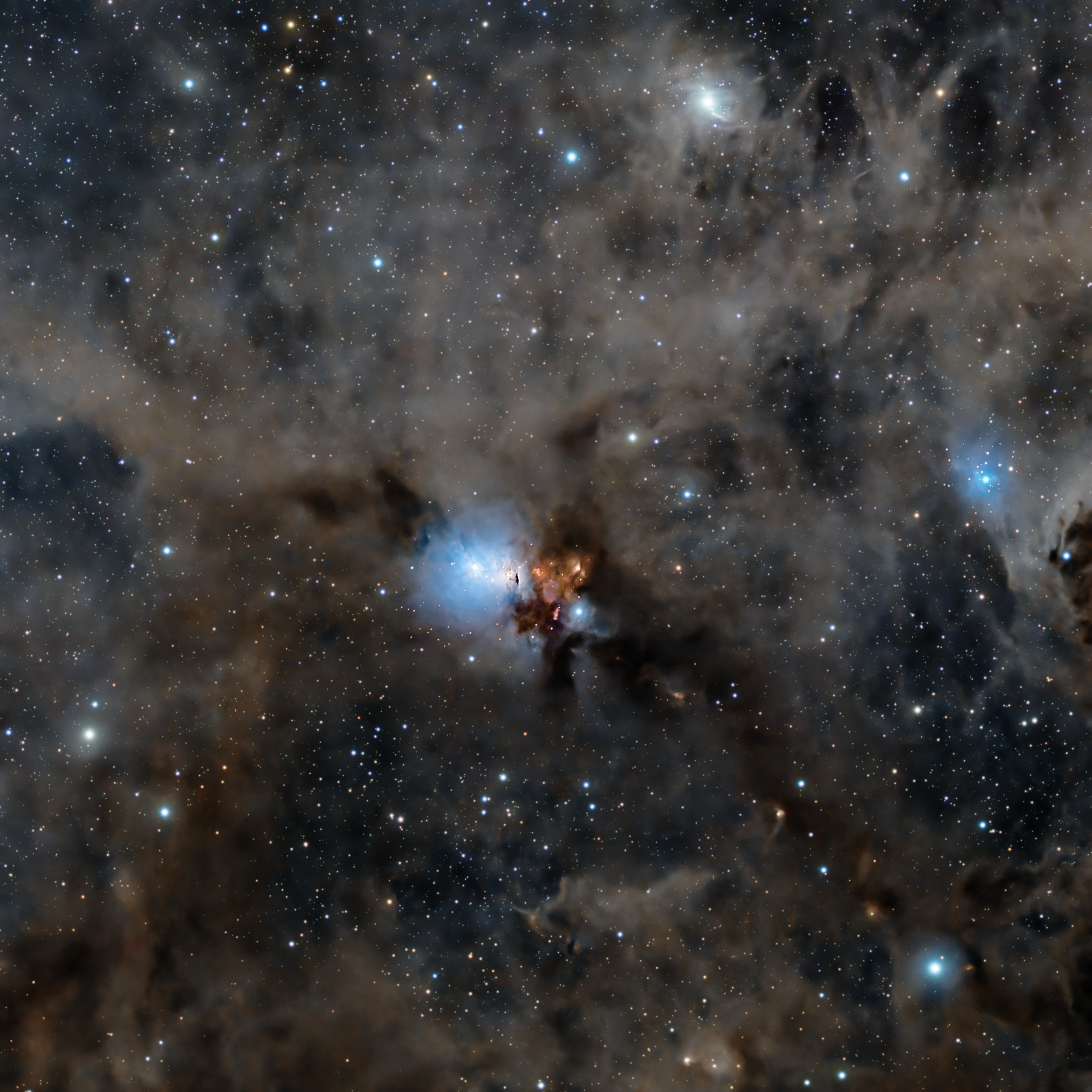The nebula region has a combined mass of approximately 450 M☉, while the cluster contains around 150 stars with a median age of a million years and a combined mass of 100 M☉. The average star formation rate is 1×10−4 M☉ yr–1. Within the nebula are 20 young stellar objects producing outflows, including Herbig–Haro objects, and a total of 95 X-ray sources that are associated with known members of embedded star clusters. In 2011 researchers reported finding 30 to 40 brown dwarf objects in the cloud and in the Rho Ophiuchi cloud complex.