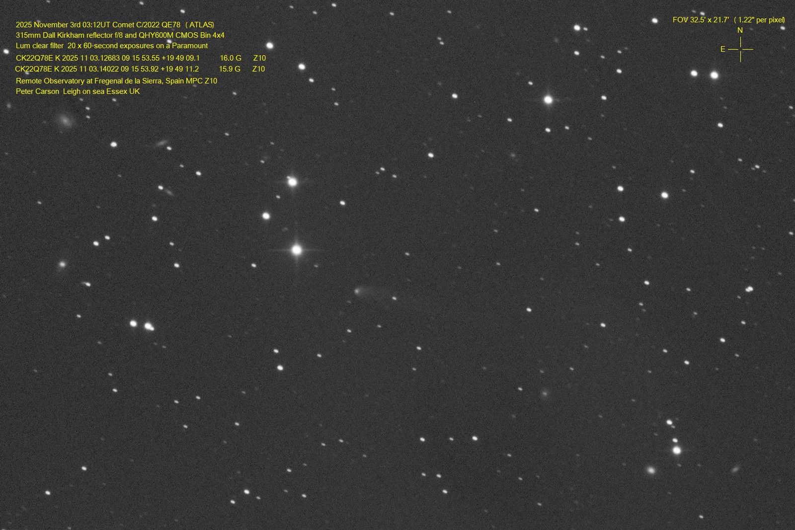 Observation by Peter Carson: C/2022 QE78 (ATLAS), observed by Peter C...