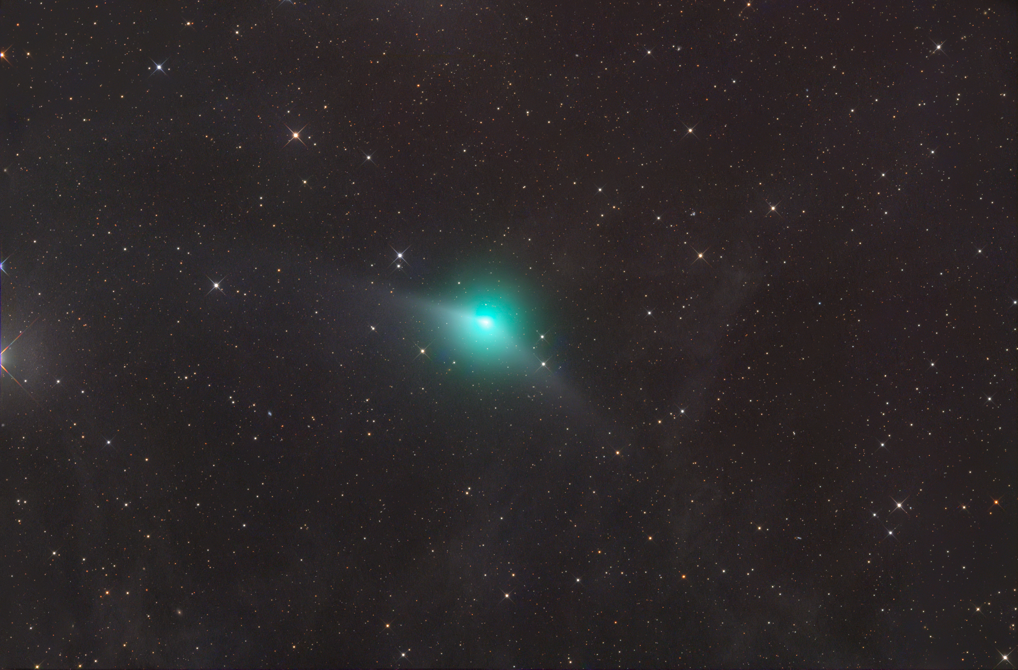 Comet C/2025 R2 Swan 09 11 2025 UT 18h15m comet with tail and antitail in a dusty region Location: Farm Tivoli, Namibia Telescope: ASA Astrograph 12" f3.6 Camera: ZWO ASI 6200 MM Pro Mount: ASA DDM 85 Exp.Time: LRGB 24/9/9/9 min. North is up FOV 76x115´ Gerald Rhemann and Michael Jäger