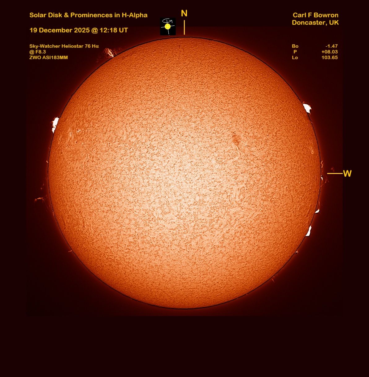 Observation by Carl Bowron: SUN 20251219 1218UT DISK HALPHA CFB