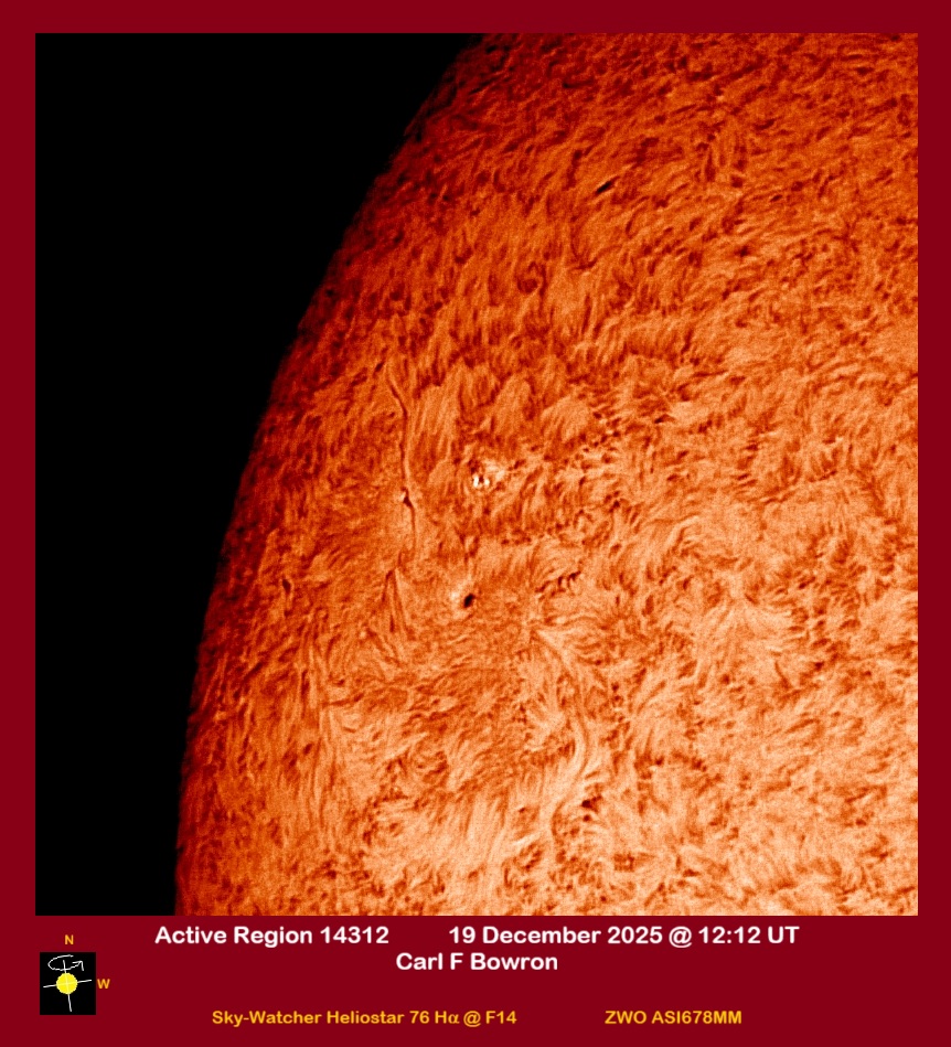 Observation by Carl Bowron: SUN 20251219 1212UT AR14312 HALPHA CFB