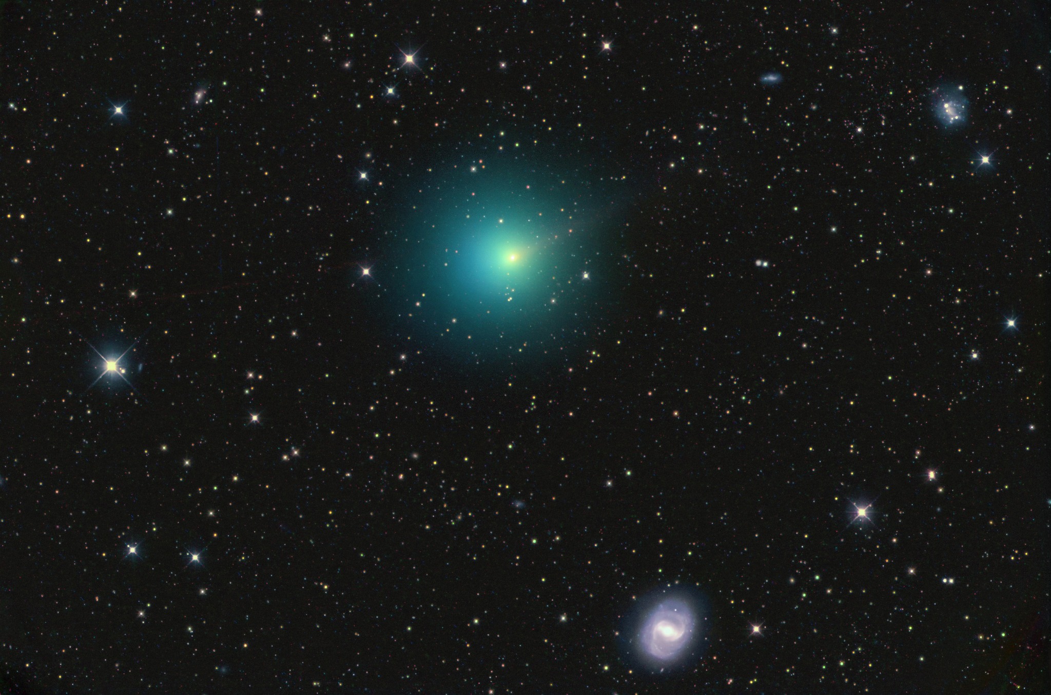 24P/Schaumasse near Messier 91 2025 dec. 29 2.25 UT RGB14x180sec 14"/4.2 QHY600 Michael Jäger, Gerald Rhemann Center (RA, Dec): (189.041, 14.878) Center (RA, hms): 12h 36m 09.888s Center (Dec, dms): +14° 52' 41.475" Size: 83.1 x 55 arcmin Radius: 0.831 deg Pixel scale: 2.44 arcsec/pixel "Orientation", may be incorrect, use at your own risk: Up is 2.1 degrees E of N