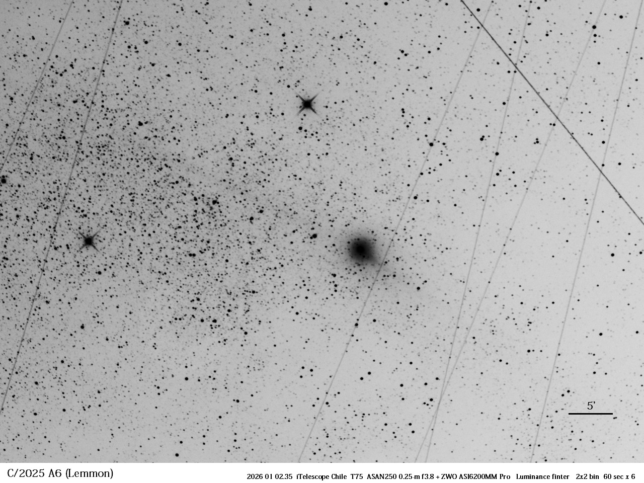 C/2025 A6 (Lemmon) A New Year comet in the Southern hemisphere. I estimated the total magnitude as 6.6 G. A coma was 4'.0 and an anti-tail was 30' or longer toward pa 65. North is up and East is left.