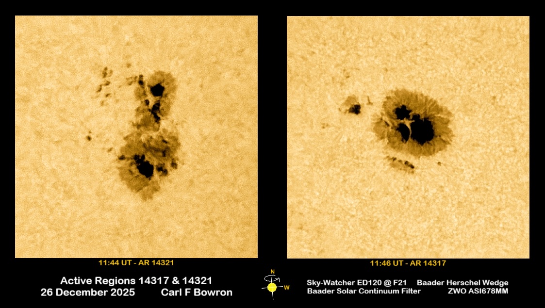 Observation by Carl Bowron: SUN 20251226 1144-1146UT ARs14317-21 WL...