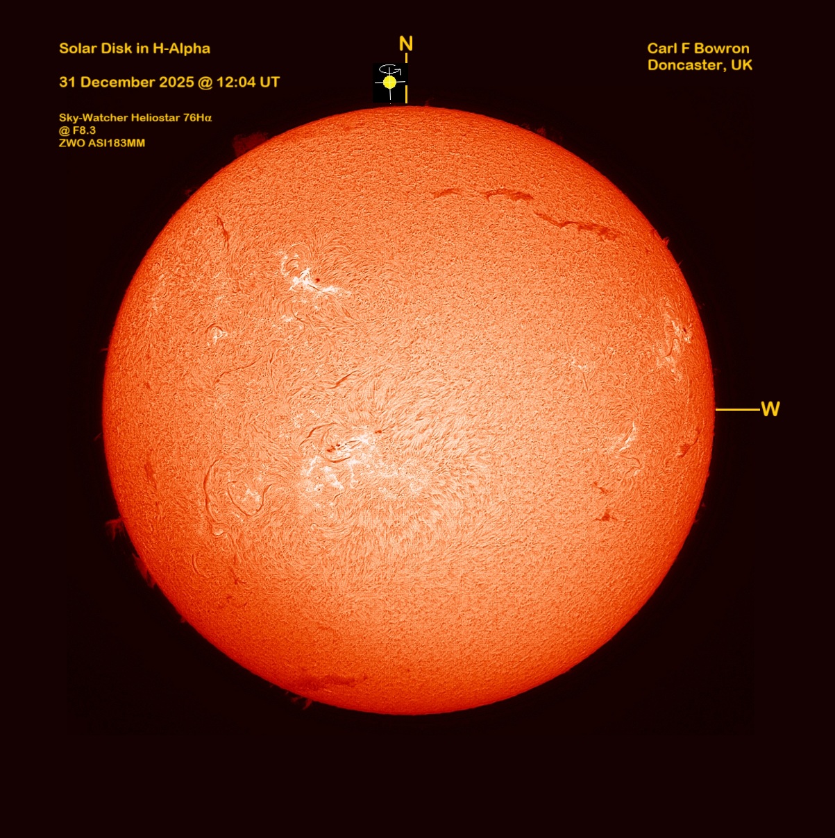 Observation by Carl Bowron: SUN 20251231 1204UT DISK HALPHA CFB