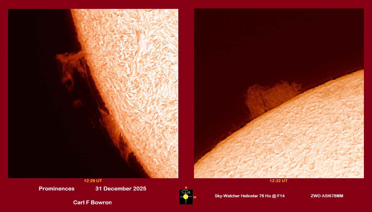 Observation by Carl Bowron: SUN 20251231 1229-1232UT PROM HALPHA CFB