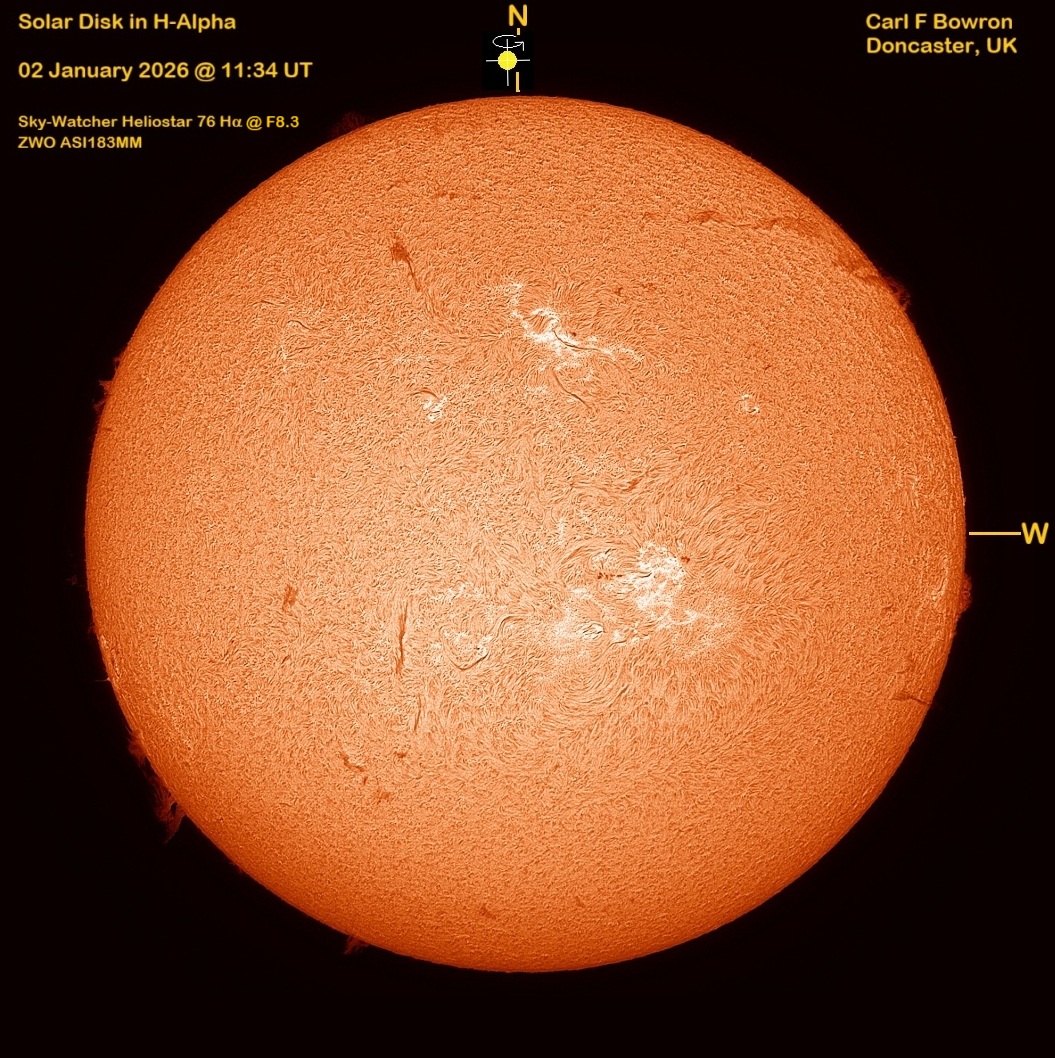 Observation by Carl Bowron: SUN 20260102 1134UT DISK HALPHA CFB