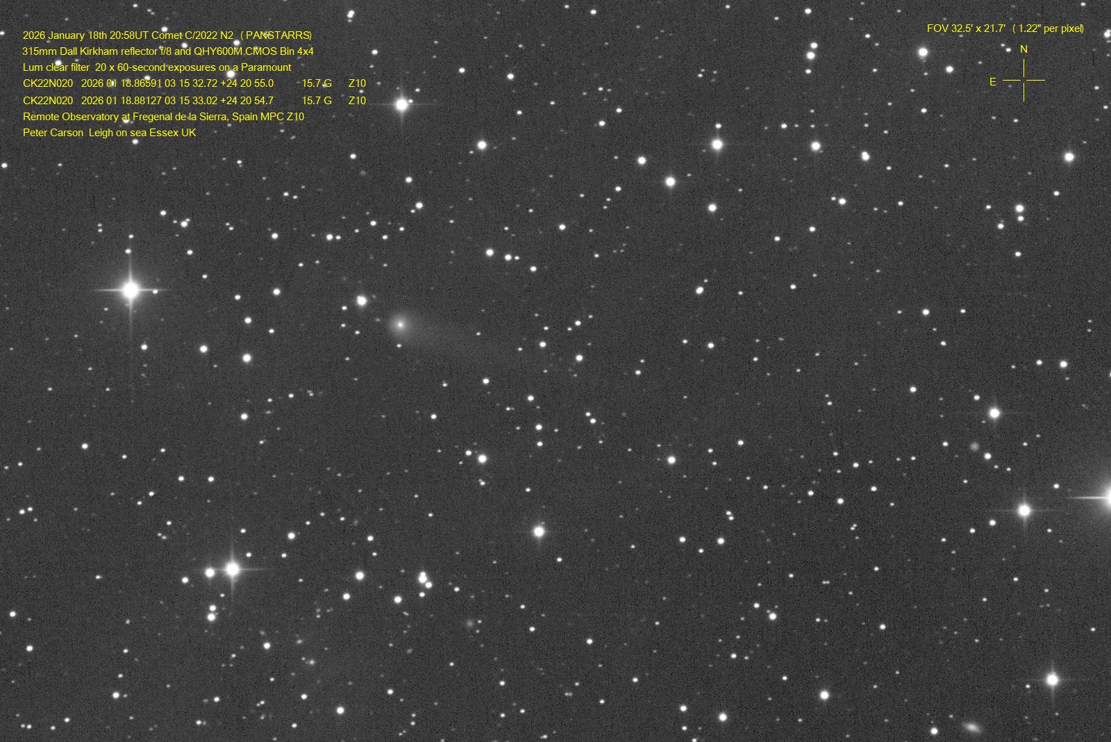 Observation by Peter Carson: C/2022 N2 (PANSTARRS), observed by Peter...