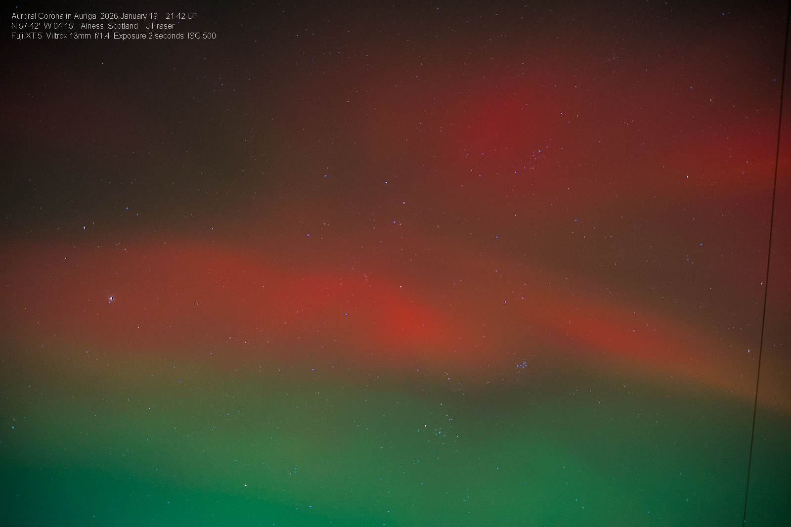 Observation by Jimmy Fraser: Aurora with corona in Auriga 2026 Januar...