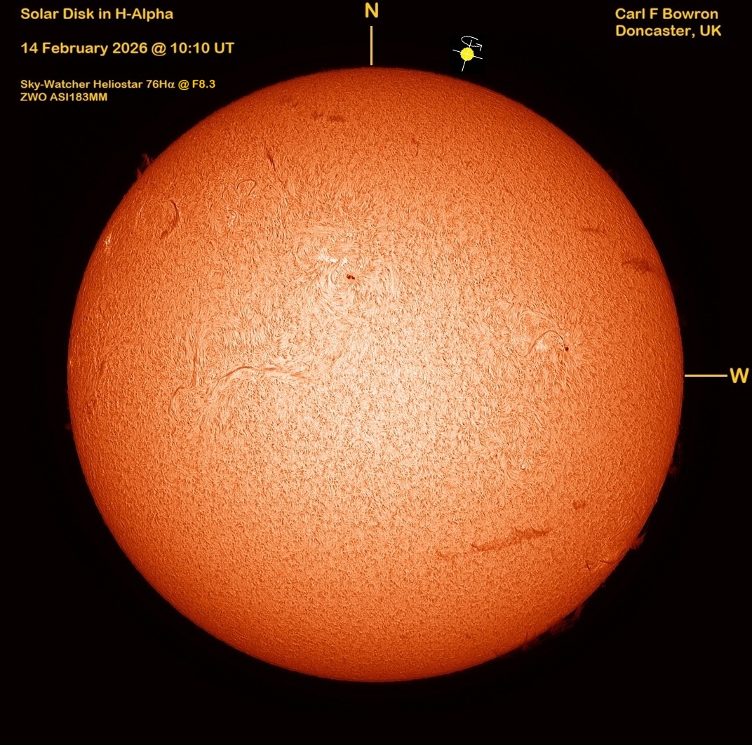 Observation by Carl Bowron: SUN 20260214 1010UT DISK HALPHA CFB