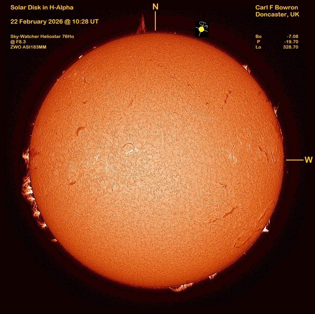 Observation by Carl Bowron: SUN 20260222 1028UT DISK HALPHA CFB