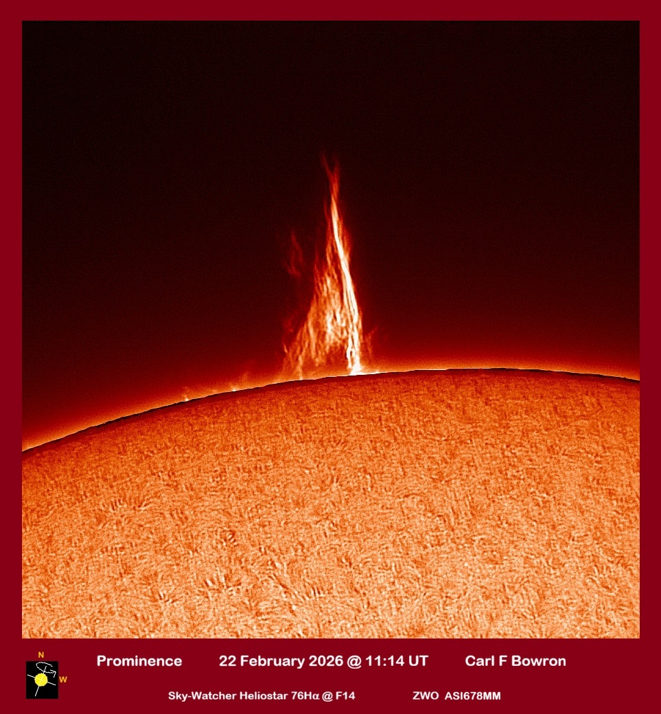 Observation by Carl Bowron: SUN 20260222 1114UT PROM HALPHA CFB