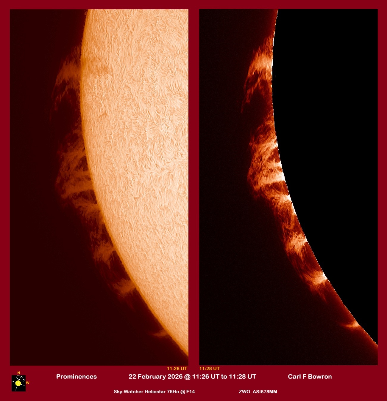 Observation by Carl Bowron: SUN 20260222 1126-1128UT PROM HALPHA CFB