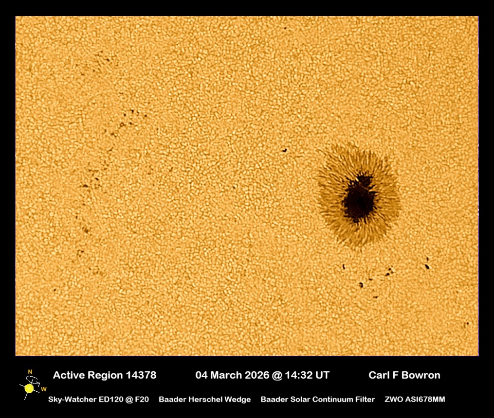 Observation by Carl Bowron: SUN 20260304 1432UT AR14378 WLIGHT CFB
