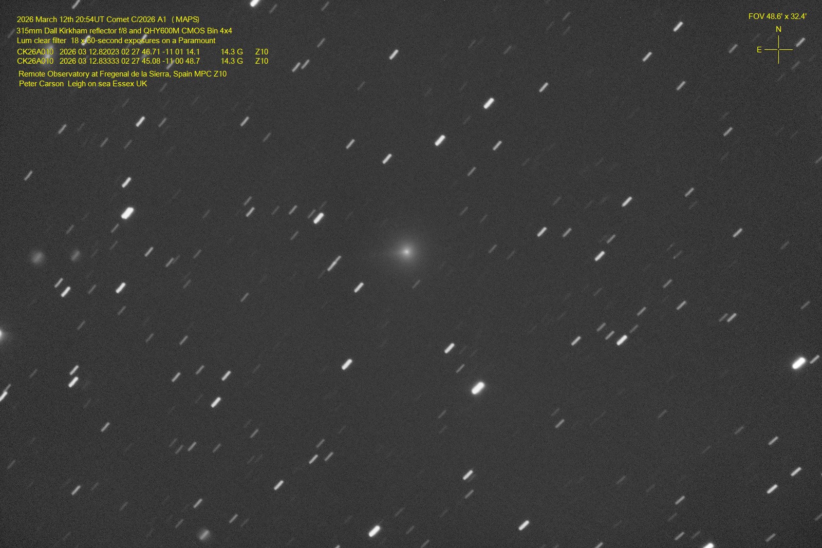 Observation by Peter Carson: C/2026 A1, observed by Peter Carson