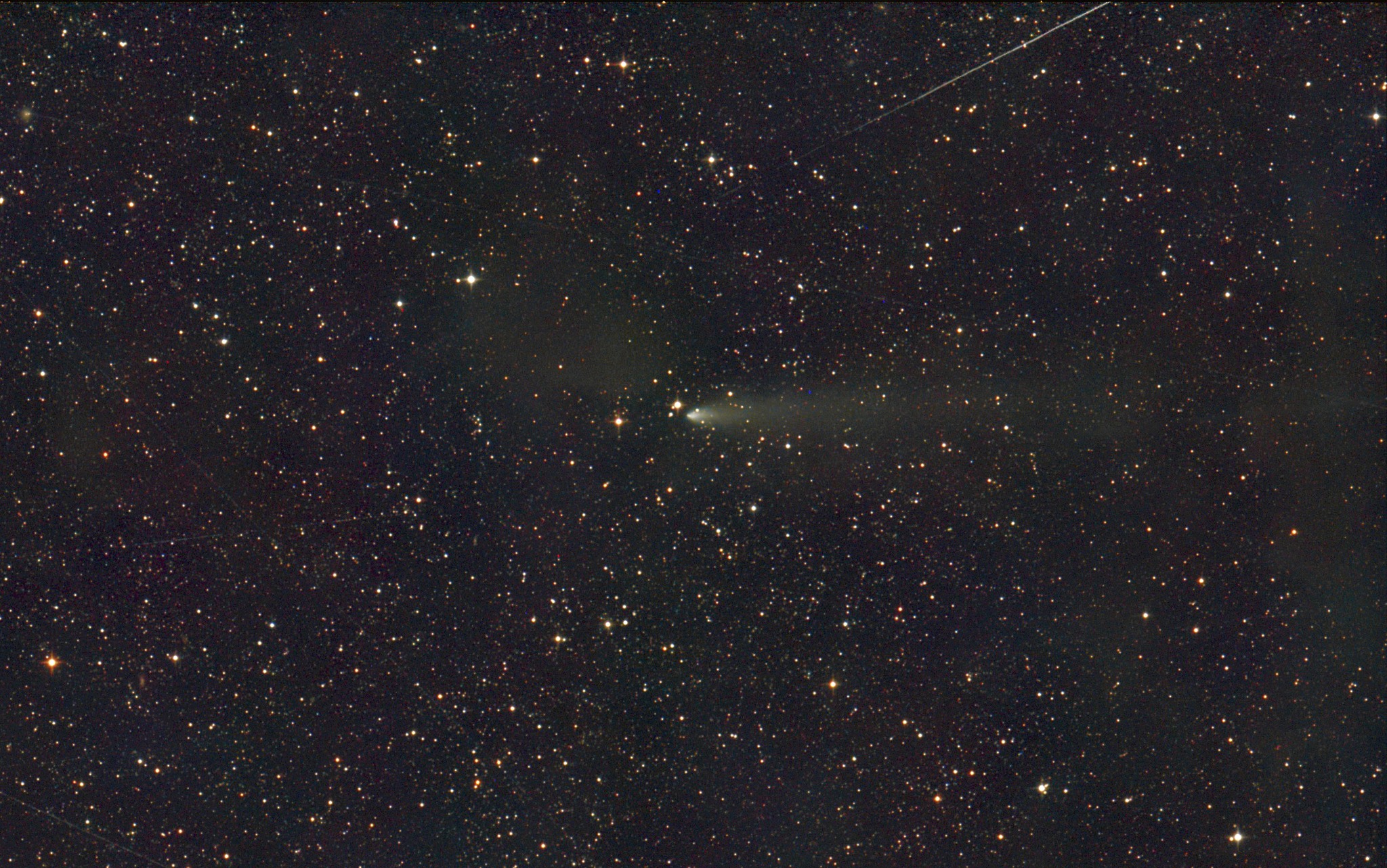 235P/LINEAR 2026-03-13 3.10 UT 7x2min 12"/4 Asi 2600 MC Michael Jäger, Gerald Rhemann Center (RA, Dec): (252.507, -17.301) Center (RA, hms): 16h 50m 01.697s Center (Dec, dms): -17° 18' 02.382" Size: 63 x 39.4 arcmin Radius: 0.619 deg Pixel scale: 1.84 arcsec/pixel "Orientation", may be incorrect, use at your own risk: Up is 0.5 degrees E of N