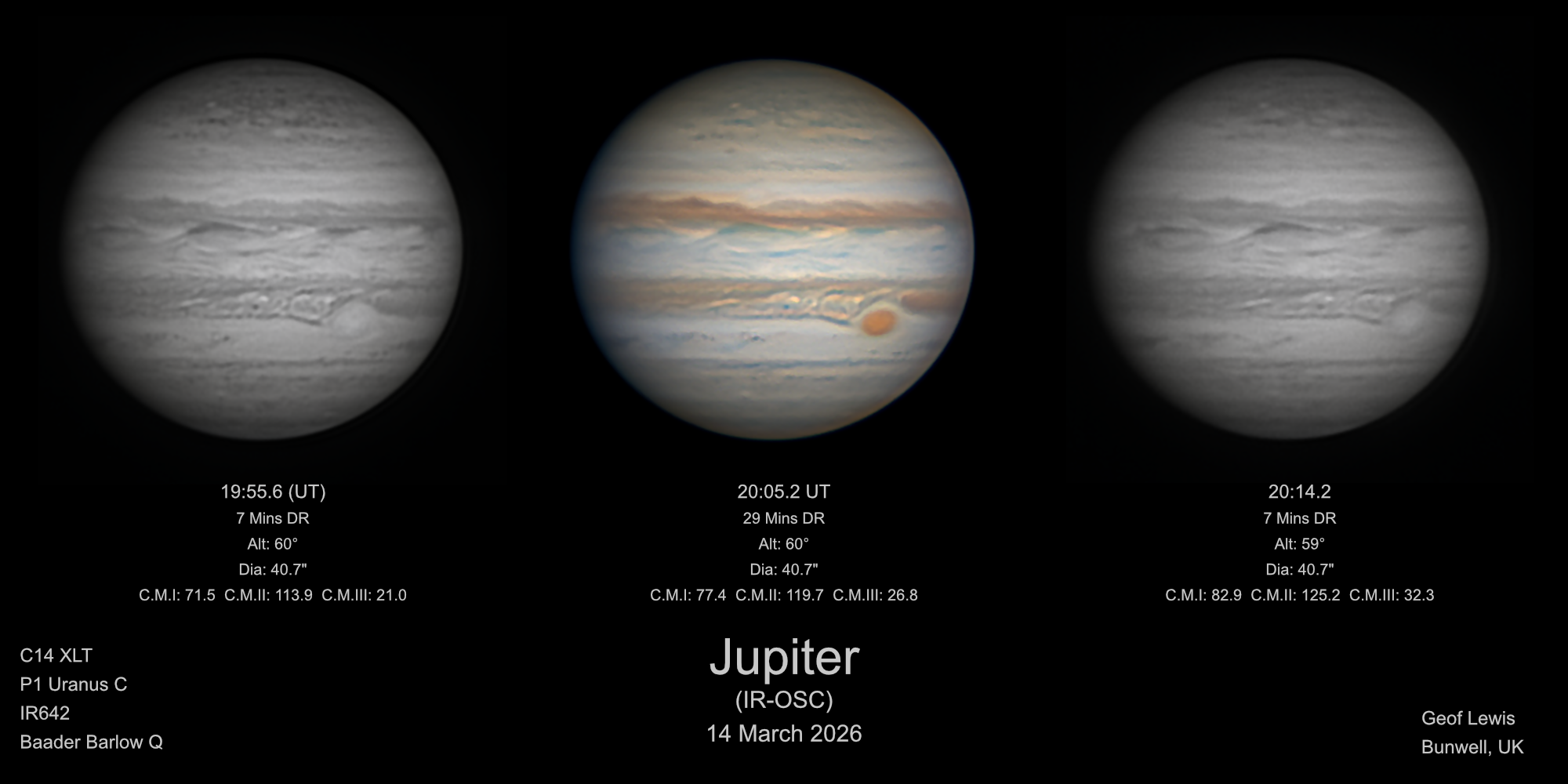 Here are my Jupiter observations from 14 March 2026. The seeing was variable, but I managed a reasonable sets of IR captures, followed by a set OSC captures before the seeing took a dive as I started to collect a second set of IR images.