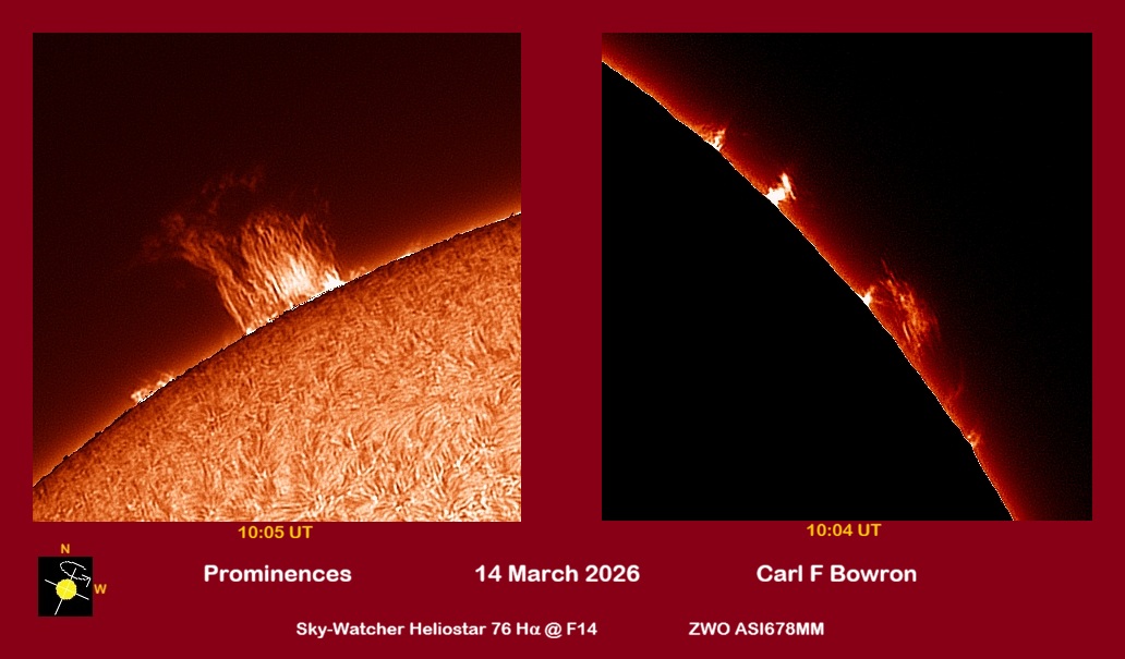 Observation by Carl Bowron: SUN 20260314 1004-1005UT PROM HALPHA CFB