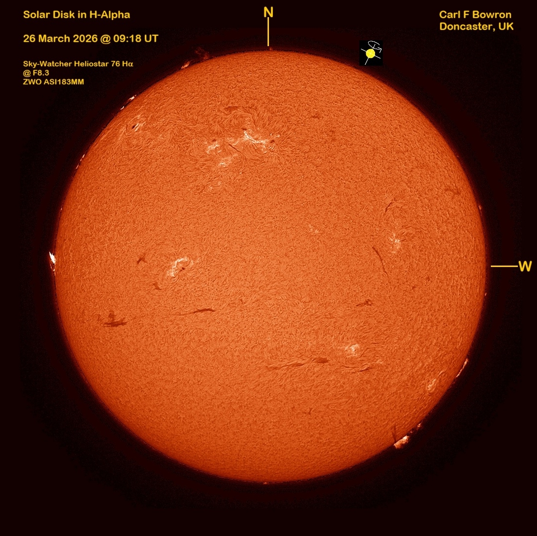 Observation by Carl Bowron: SUN 20260326 0918UT DISK HALPHA CFB