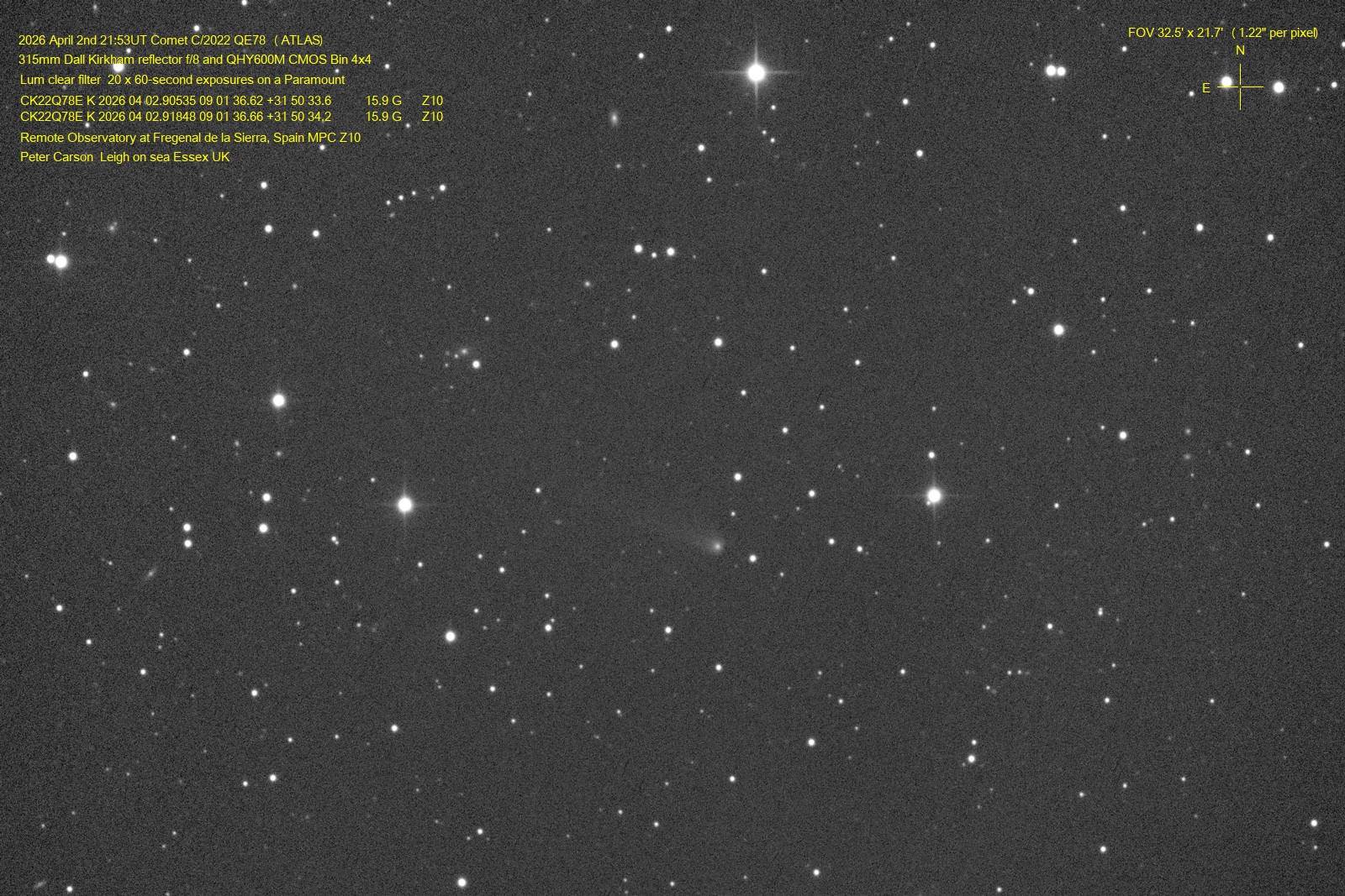 Observation by Peter Carson: C/2022 QE78 (ATLAS), observed by Peter C...
