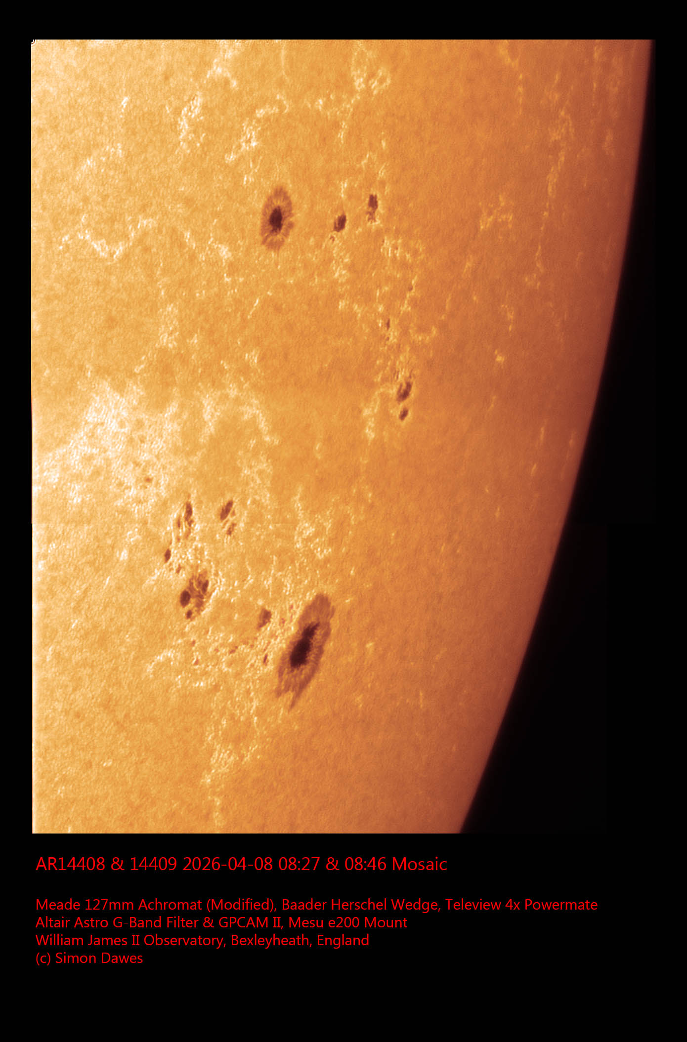 Observation by Simon Dawes: AR14408 AR14409 2026-04-08 0846UT