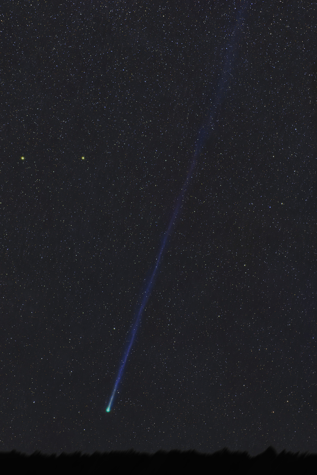 Comet: C/2025 R3 Panstarrs -Date/Time Local: 4/9/26 3:55am MST -Date/Time UT: 3/26/26 10:55 UT -FOV: 6.9 x 10.3 degrees -Orientation: W up -Seeing:1 -Transparency: 3 -Scale: 23 arcsec/Pixel -Instrument: Zeiss Milvus 135mm f/2 -Exposure: 28 min total -Camera: ASI2600MC -Location: Payson,AZ The field here is 10 degrees tall, and this tail certainly exceeds that but is quite faint at that point. The tail seems to consist of many broken blue streamers following an emerald green coma and brilliant stellar nucleus. All subframes were stacked on the first image of the set to preserve the horizon.