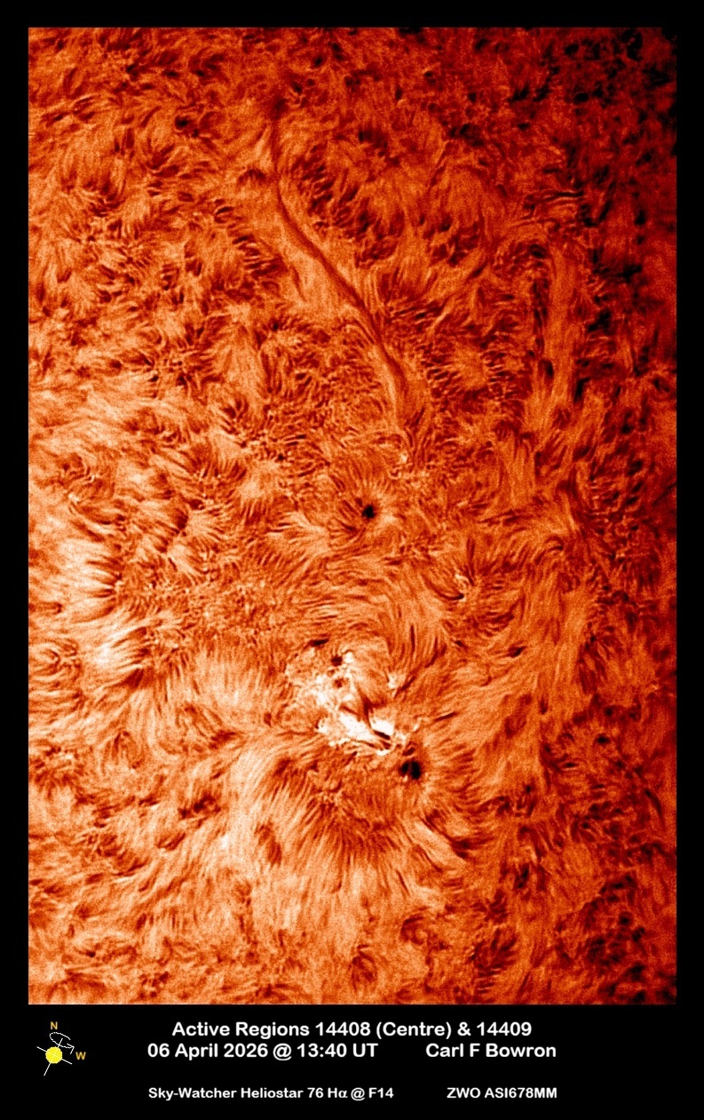Observation by Carl Bowron: SUN 2026-04-06 1340UT ARS14408-09 HALPHA...