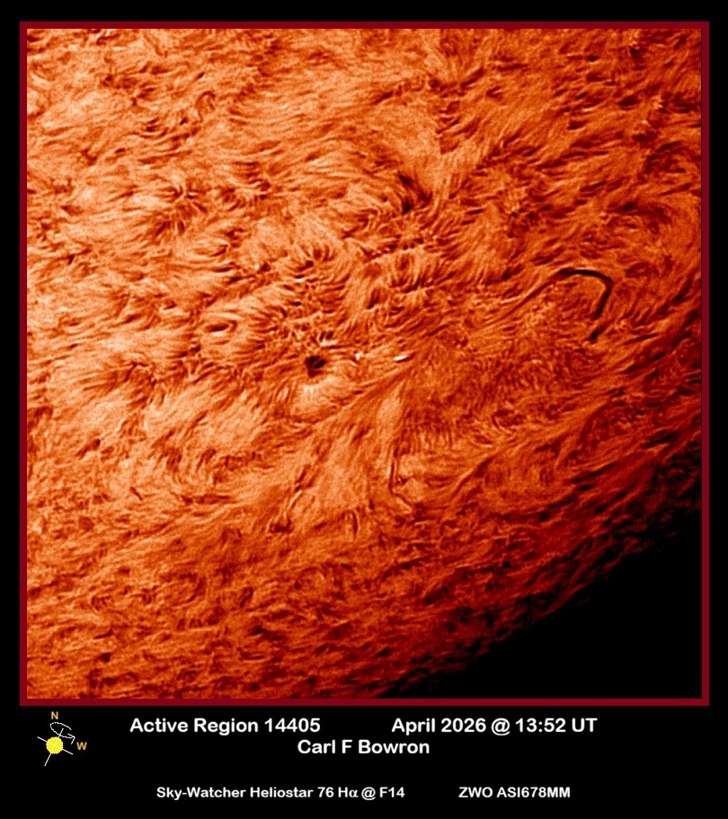 Observation by Carl Bowron: SUN 2026-04-06 1352UT AR14405 HALPHA CFB