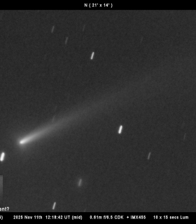 | Equipment: | 0.61m CDK | | Exposure: | 10 x 15 sec luminance | | Location: | Auberry California | | Observer: | Martin Mobberley | | Target name: | C/2025 K1 (ATLAS) |