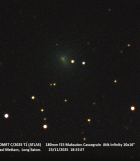 | Equipment: | 180mm Maksutov-Cassegrain f15. ATIK Infinity camera | | Exposure: | 10x16" | | Location: | Long Eaton | | Observer: | Paul Mettam | | Target name: | Comet C/2025 T1 (ATLAS) |