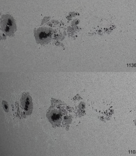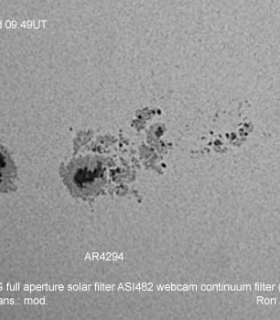 | Equipment: | Skywatcher 82 mm Evolux f/6.5 refractor, Baader solar continuum filter (10 nm version), x2 barlow, ZWO ASI678MM camera | | Exposure: | exp time 0.29 msec, each image is a stack of best 300 of 12,000-frame video | | Location: | Suburban North Leeds | | Observer: | John Arnold | | Target name: | Sunspot groups AR4294, 4296, 4298 on two consecutive days |