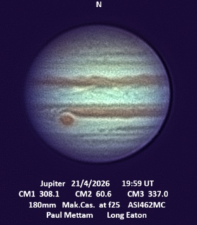 | Equipment: | 180mm Maksutov-Cassegrain f15. ASI 462MC | | Exposure: | Live Stacking 1000 frames in Sharpcap | | Location: | Long Eaton | | Observer: | Paul Mettam | | Target name: | JUPITER |