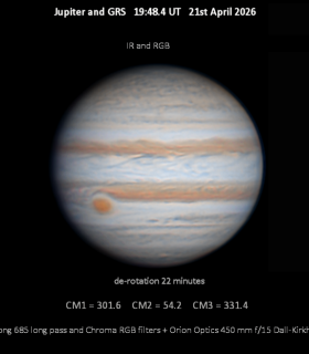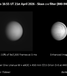 | Equipment: | Player One Uranus-M, Optalong 685 nm long pass filter, Chroma Jovian CH4 filter, Sunobserver eADC, Orion Optics 450 mm f/15 Dall-Kirkham (at 440 mm), Mesu E200 Mk 2 Mount | | Location: | urban Berkshire | | Observer: | Peter Tickner | | Target name: | Jupiter IR and CH4 comparison |