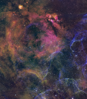 | Equipment: | Askar SAQ70 336mm, Player One Poseidon-M Pro mono, Antlia 3nm SHO filters, Antlia RGB Vpro filters for stars | | Exposure: | 14 hours (300 sec subs) | | Location: | Yass, New South Wales | | Observer: | Des Middlemass | | Target name: | The north western area of the Vela supernova remnant |