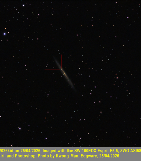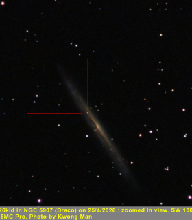 | Equipment: | Skywatcher 100EDX refractor, ZWO ASI585mc pro, Skywatcher HEQ5 Pro | | Exposure: | 120secs gain 200 | | Location: | Edgware, Middlesex | | Observer: | Kwong Man | | Target name: | SN 2026kid in NGC 5907 in Draco |