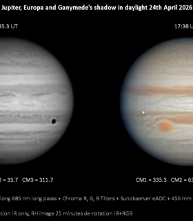| Equipment: | Player One Uranus-M, Optalong 685 nm long pass filter, Chroma RGB filters, Sunobserver eADC, Altair 8 position filter wheel, Orion Optics 450 mm f/15 Dall-Kirkham (at 440 mm), Mesu E200 Mk 2 Mount | | Location: | urban Berkshire | | Observer: | Peter Tickner | | Target name: | Jupiter, Europa, Ganymede's shadow and the GRS |