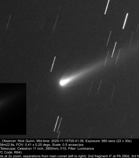 | Equipment: | Celestron C11, ZWO ASI-2600MM Pro | | Exposure: | 22 x 30s | | Location: | Steyning, West Sussex | | Observer: | Nick Quinn | | Target name: | C/2025 K1 |