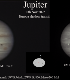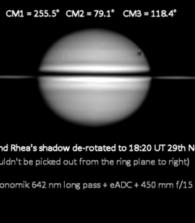 | Equipment: | Player One Uranus-M, Astronomik 642 nm long pass filter, Sunobserver eADC, Orion Optics 450 mm f/15 Dall-Kirkham , Mesu E200 Mk 2 Mount | | Location: | urban Berkshire | | Observer: | Peter Tickner | | Target name: | Saturn and Rhea's shadow |