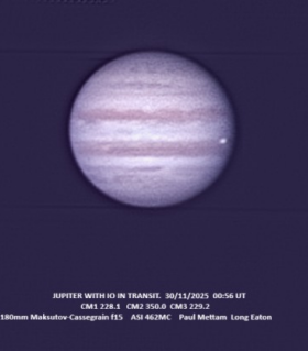 | Equipment: | 180mm Maksutov-Cassegrain f15. | | Exposure: | Live Stacking 1000 frames in Sharpcap | | Location: | Long Eaton | | Observer: | Paul Mettam | | Target name: | JUPITER |