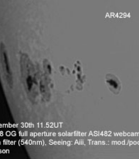 | Equipment: | 102mm f9.8 OG full aperture solar filter ASI482 webcam Continuum filter | | Location: | Ewell, Surrey | | Observer: | Ron Johnson | | Target name: | Sun |