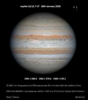 | Equipment: | ZWO ASI183MM, Astronomik 642 nm long pass filter and Chroma RGB filters, Sunobserver eADC, Orion Optics 450 mm f/15 Dall-Kirkham, Mesu E200 Mk 2 Mount | | Location: | urban Berkshire | | Observer: | Peter Tickner | | Target name: | Jupiter 28th January |