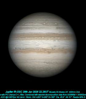 | Equipment: | 444mm Dobsonian, ASI585MM with 642nm filter for IR, Player One Uranus C camera with L filter for colour | | Location: | St. Albans | | Observer: | Martin Lewis | | Target name: | Jupiter |
