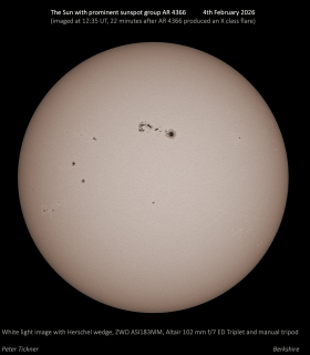 | Equipment: | ZWO ASI183MM, 2" Herschel wedge, Altair 102 mm f/7 ED Triplet APO, Manual tripod | | Location: | urban Berkshire | | Observer: | Peter Tickner | | Target name: | The Sun |