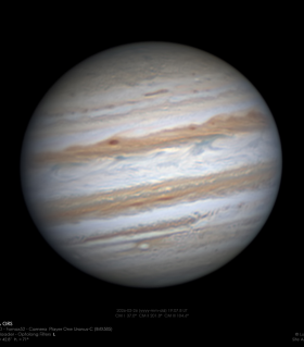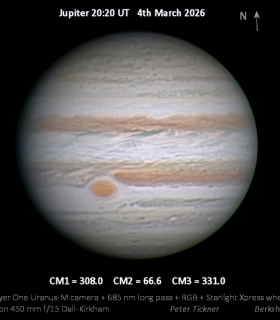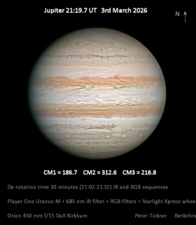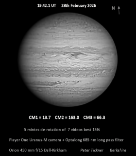 | Equipment: | Player One Uranus-M, Optalong 685 nm long pass filter, Orion Optics 450 mm f/15 Dall-Kirkham, Mesu E200 Mk 2 Mount | | Location: | urban Berkshire | | Observer: | Peter Tickner | | Target name: | Jupiter IR 28th February |