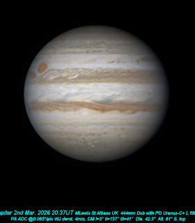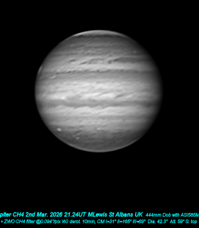 | Equipment: | 444mm Dobsonian, ASI585MM with ZWO Methane filter | | Location: | St Albans, UK | | Observer: | Martin Lewis | | Target name: | Jupiter |