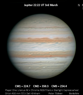 | Equipment: | Player One Uranus-M, Optalong 685 nm long pass filter, Chroma RGB filters, Starlight Xpress filter wheel, Orion Optics 450 mm f/15 Dall-Kirkham, Mesu E200 Mk 2 Mount | | Location: | urban Berkshire | | Observer: | Peter Tickner | | Target name: | Jupiter IR RGB 3rd March |